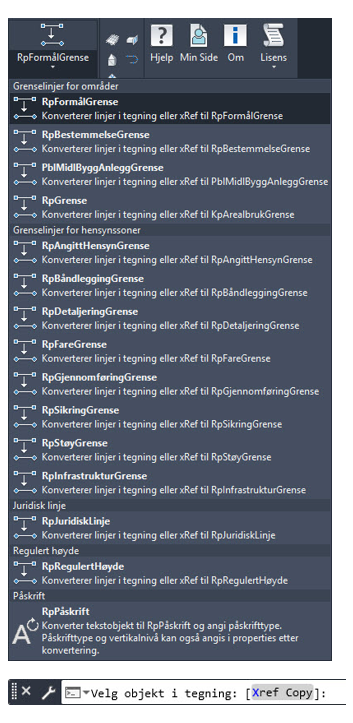I menyen kan man velge hvilken objekttype man vil konvertere til. Velg så objektet i tegningen. Man kan på lik linje velge objekter, og så konvertere dem. NB! Dersom man ønsker å konvertere linjer eller tekst som ligger i en xref må man spesifisere dette ved å trykke «x» for xref i kommandolinjen før man velger objektene.