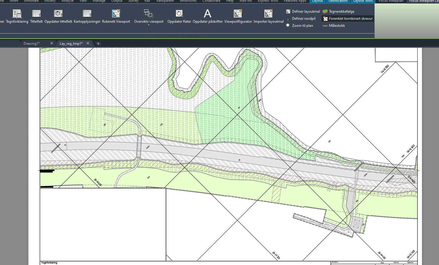 Oversiktsviewport for kartpland sørger for å filtrere ut alle lag utenom lag for rutenett-rammer og plangrenser. Rutenett-rammen fargelegges rød dersom den er knyttet til en viewport i samme layout man står i når man plasserer oversikts-viewporten.
