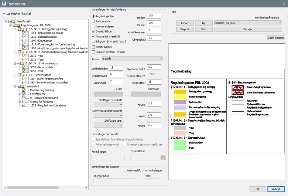 Det samme vinduet vil dukke opp dersom man er i et layout og trykker på Tegnforklaring i den kontekstbaserte menyen i Focus Arealplan Layout-fanen.
