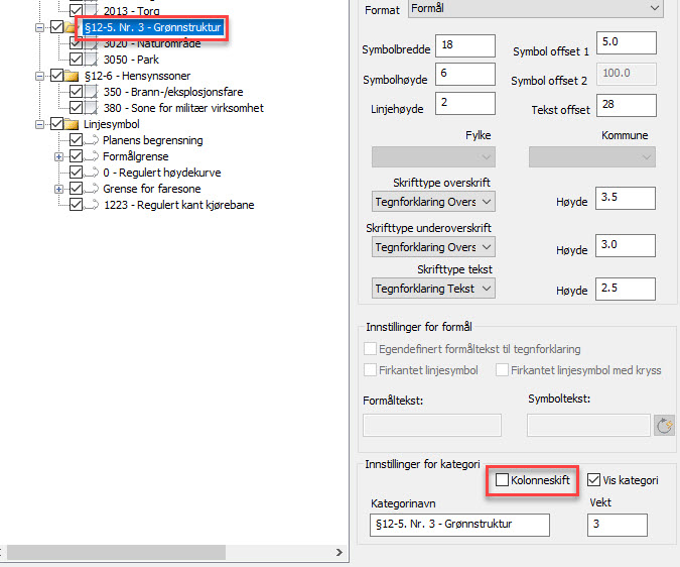 Til høyre er det mulig å gjøre tilpasninger for ulike detaljer i tegnforklaringen, samt forhåndsvisning av tegnforklaringen.