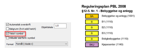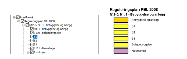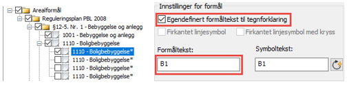 Man kan også gi egendefinerte navn på formål i tegnforklaringen slik at de samsvarer med navnene man har satt i selve planen. Under er formålet Boligbebyggelse* merket av (først den øverste av dem) og Egendefinert formåltekst til tegnforklaring er aktivert. Man kan da angi et eget navn for dette formålet - i dette tilfellet B1. Det samme gjøres med de andre Boligbebyggelse*-formålene – henholdsvis navnene B2 og B3.