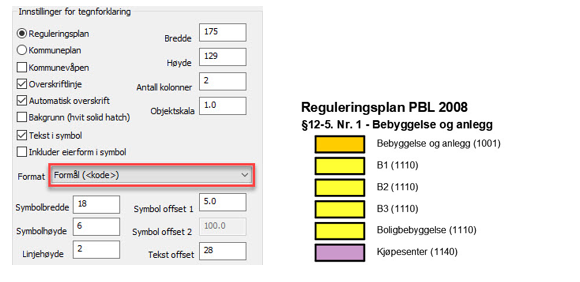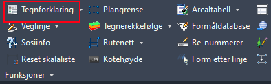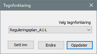Starter man funksjonen kan man velge mellom tegnforklaring for kommuneplan eller reguleringsplan. Man kan også sette inn en ny tegnforklaring eller endre tegnforklaringen. Har man satt inn en tegnforklaring og gjort endringer i planen, kan man velge å oppdatere tegnforklaringen med Oppdater-knappen.