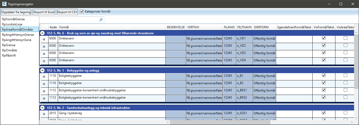 Tegningsnavigatoren kan benyttes for å få oversikt over alle egenskaper som er satt på objektene i tegningen, og gjøre redigeringer direkte fra tegningsnavigatoren. Man kan også eksportere all planinformasjonen til Excel for å behandle dataene videre der.