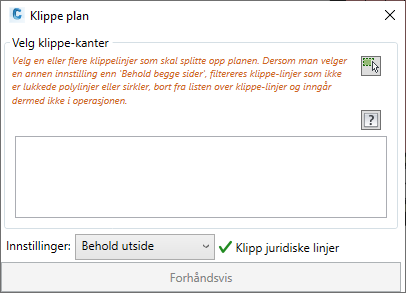 Dersom man har behov for å klippe ut deler av planen, finnes det en funksjon Klippe plan som er tilgjengelig fra funksjoner-panelet om man utvider panelet.