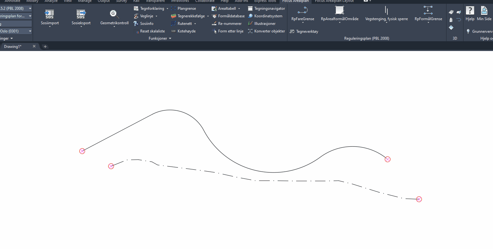 Med form etter linje-funksjonen kan man sørge for at to linjer er sammenfallende innenfor et gitt intervall. Dette er nytting når man for eksempel har hensynsoner som skal følge plangrensen og datagrunnlaget for hensynsonegrensene ikke matcher plangrensen 100%.