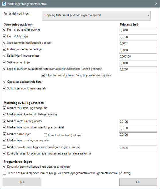 Innstillinger for geometrikontrollen er delt inn i operasjoner som endrer geometrien til objektene i planen, og operasjoner som kun markerer feil eller advarsler på geometrien.