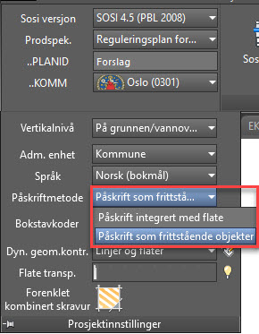 Ved å velge frittstående flatepåskrift representeres flatepåskrifter ved hjelp av MText-objekter som er koblet mot arealformålet ved hjelp av en FIELD verdi som leser egenskapen fra flaten.