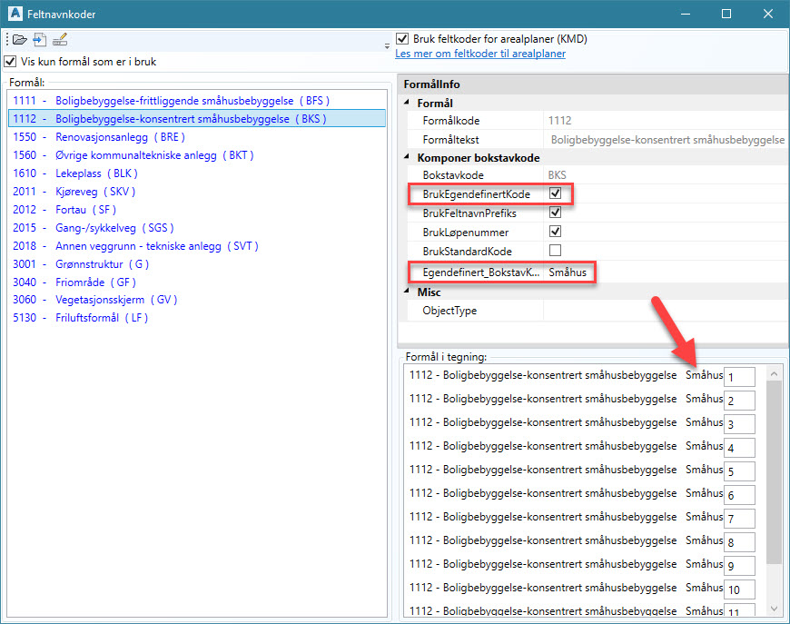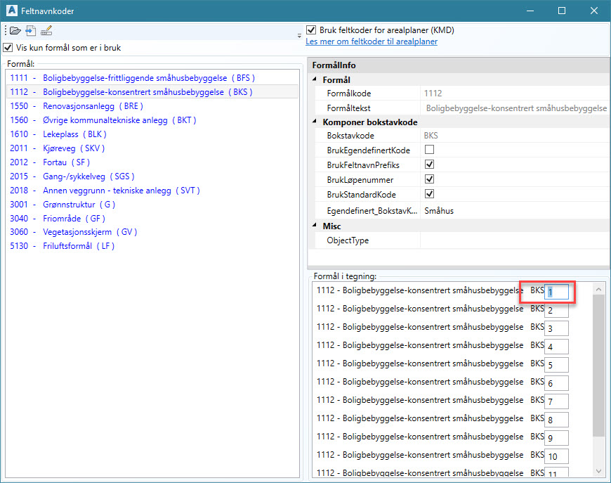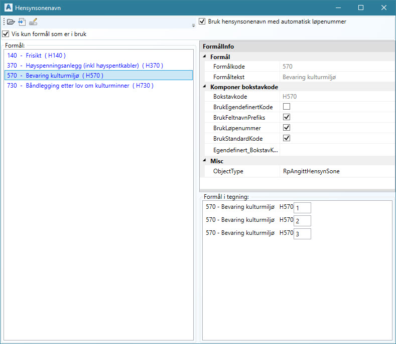 Formål som er i bruk i planen vises som standard, og er markert med grønn farge.