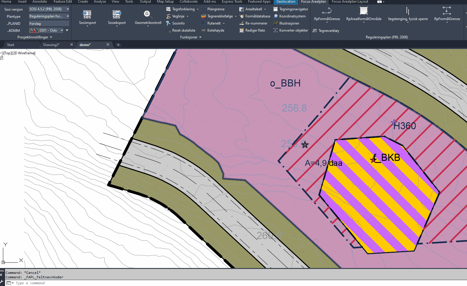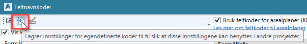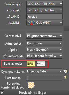 Feltnavn-listen ligger tilgjengelig i Focus Arealplan. Innstillinger for feltnavn og hensynssonenavn finner man under prosjektinnstillingene:
