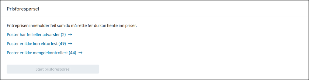 For å kunne start en prisforespørsel må entreprisen være uten feil, og alle poster må være korrekturlest og mengdekontrollert.