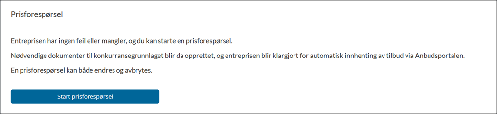 - Du skal da få meldingen "Entreprisen har ingen feil eller mangler, og du kan starte en prisforespørsel".