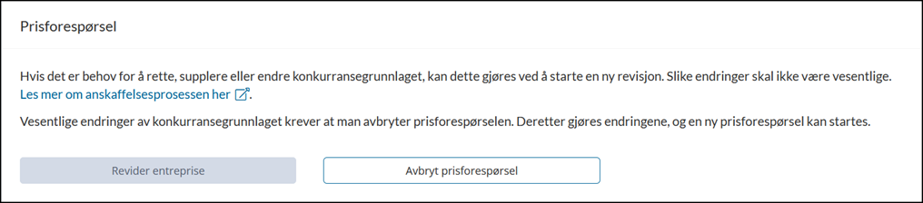 Hvis du avbryter prisforespørselen blir entreprisen satt tilbake til spesifikasjonsfasen, og åpnet for endringer igjen. Postene beholdes slik de er nå. Alle revisjoner blir fjernet. Anbudskonkurransen i Anbudsportalen blir avlyst, og eventuelle leverandører får melding om dette via e-post.